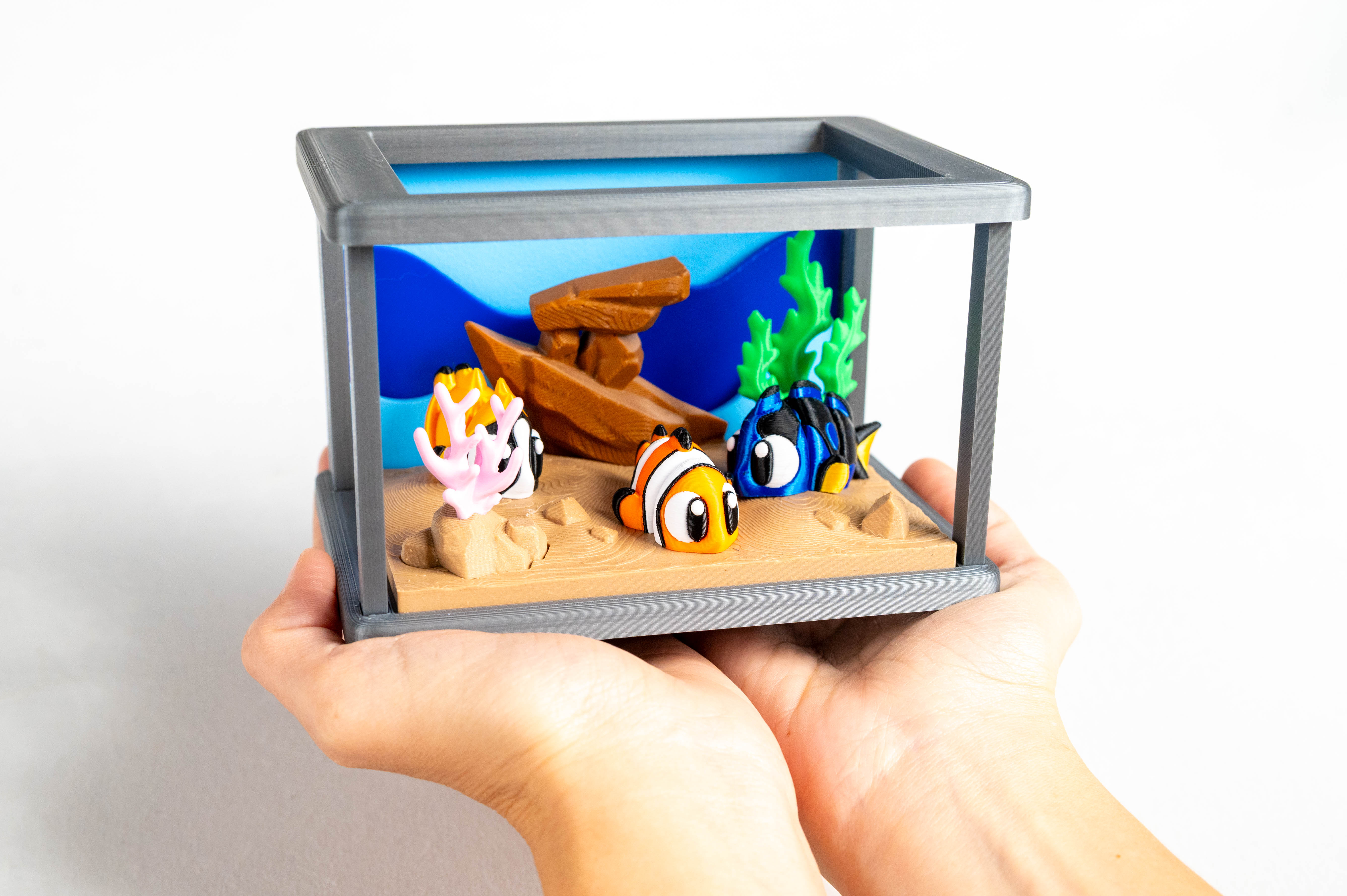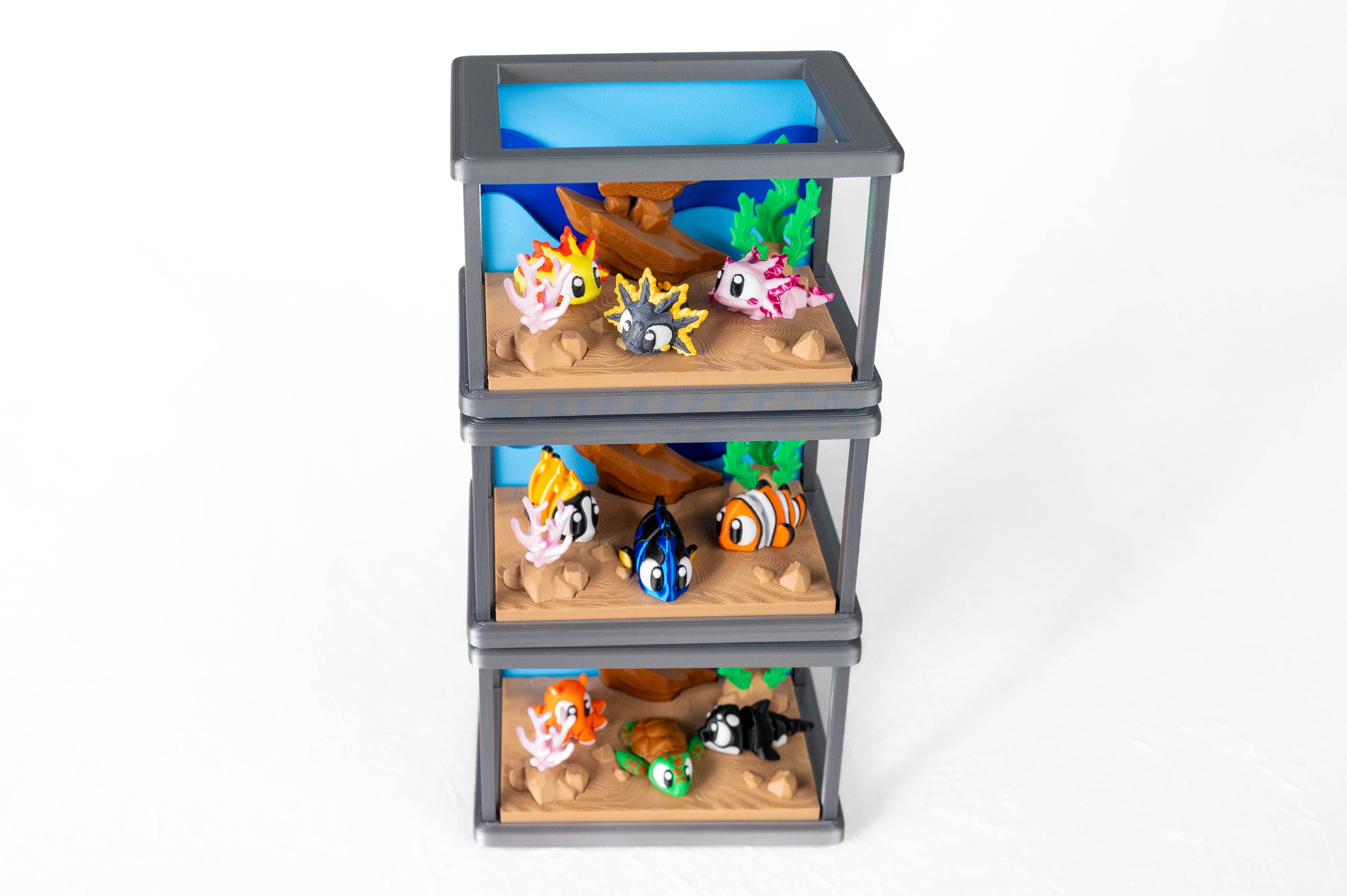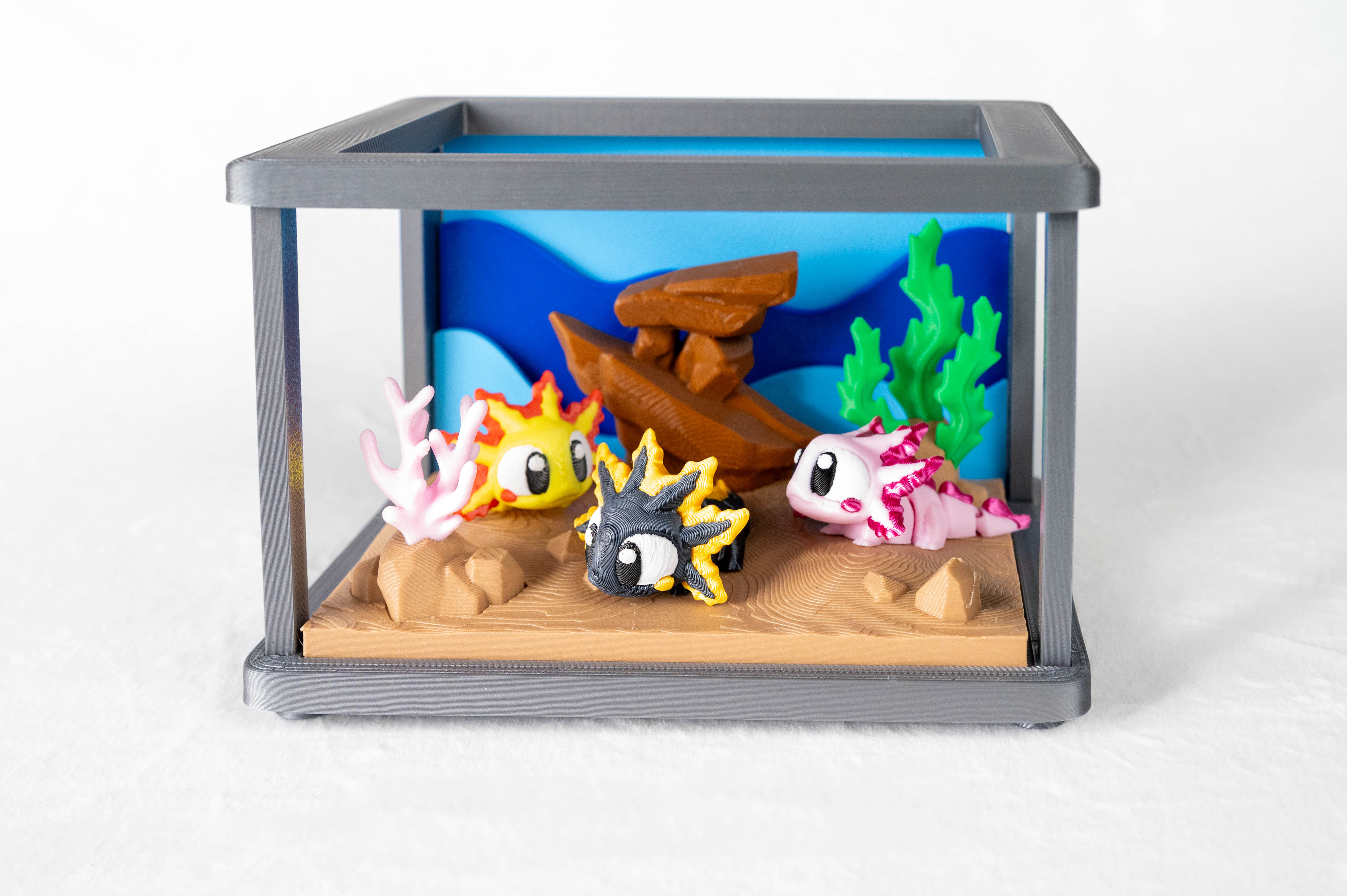 These fully articulated fidget toys, Aquarium with Fish, Sea, and Axolotl themes, feature animals with flexible bodies adorned with delicate details. The aquarium comes assembled, but the little Fiddlies are not attached, so that they can be played with or placed around however you like.