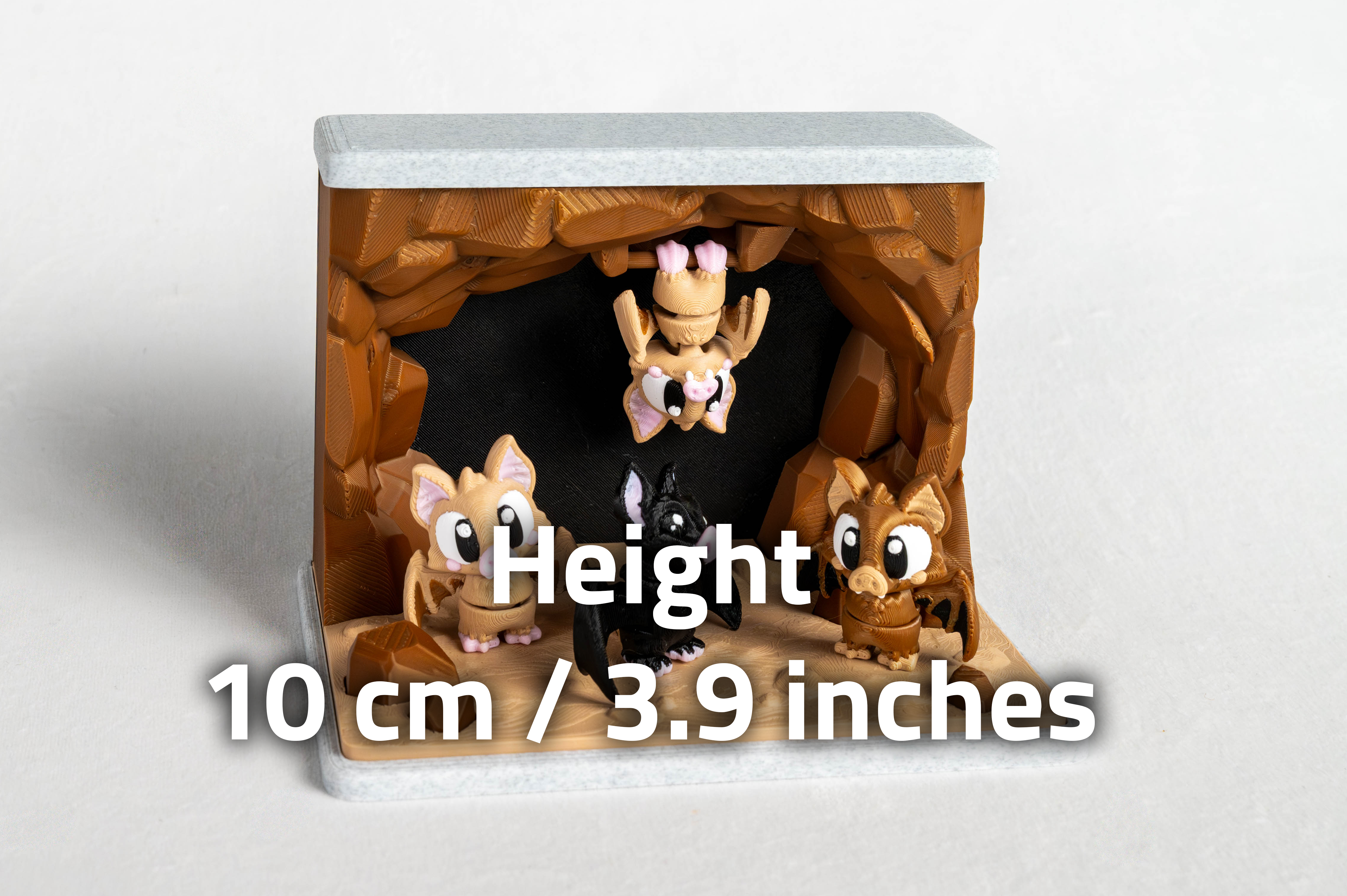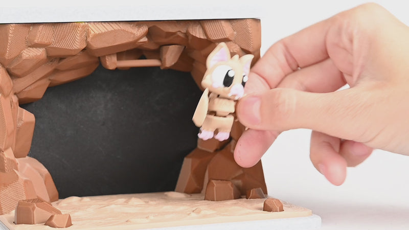 Discover the 3D Printed Bat Cave with 4 Fiddly Bats, a collectible set that’s both playful and spine-tinglingly cute! Each bat features movable wings and joints, perfect for fidgeting or displaying. The cave arrives ready to go, and one special bat can be clipped underneath to hang upside-down and gently wiggle, bringing the scene to life. Create your own miniature bat colony on your desk or shelf!