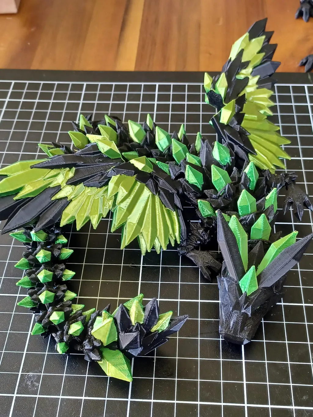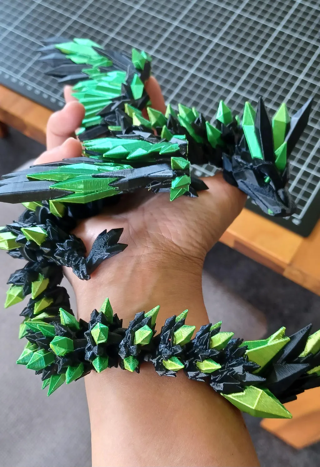🐉 Fully articulated with spread wings. Every segment of the body moves, and the wings hold their shape while the tail curls and wiggles. Built for fidgeting, display, or both. One reviewer uses it as a break-time fidget at work.