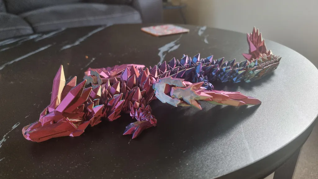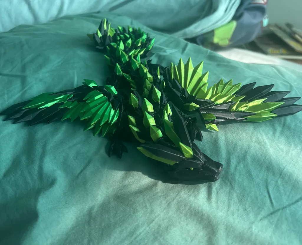 The one that stops people mid-scroll. The Crystalwing Dragon is a fully articulated 3D dragon with spread wings, a crystal-textured body, and colours that look completely different depending on the light. One reviewer said the colours and shininess "are not done justice in photos." Another called it stunning, noting how yellow shines through the green in sunlight 🐉