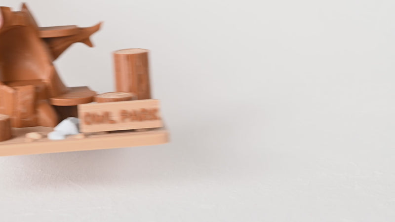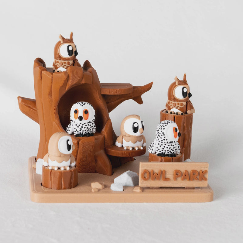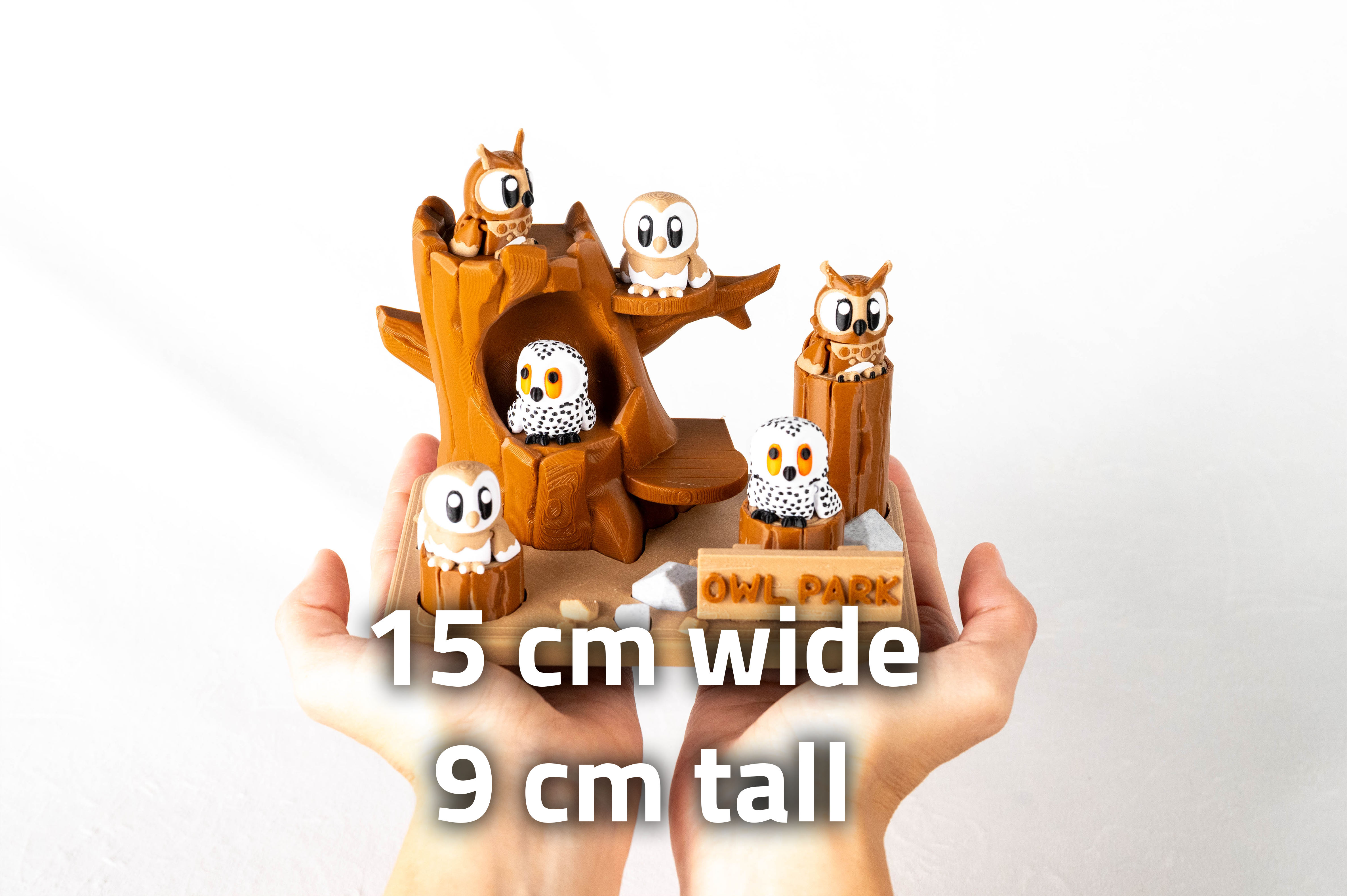 Owl Park is our new Fiddly Home for 6 owl Fiddlies featuring Barn Owl, Eagle-Owl, and even the Snowy Owl. All owls are articulated fidget toys with moveable features. The Owl Park arrives assembled, and you can place your Owl Fiddlies anywhere around it.